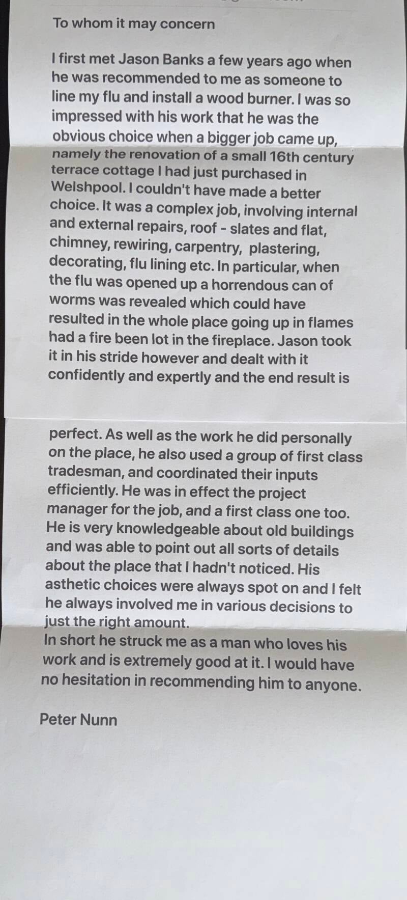 "Jason - You've been fantastic! Thank you so much for making the house into a lovely home and for all your excellent advice, and your coordinating such a brilliant team. It has been a pleasure working with you."